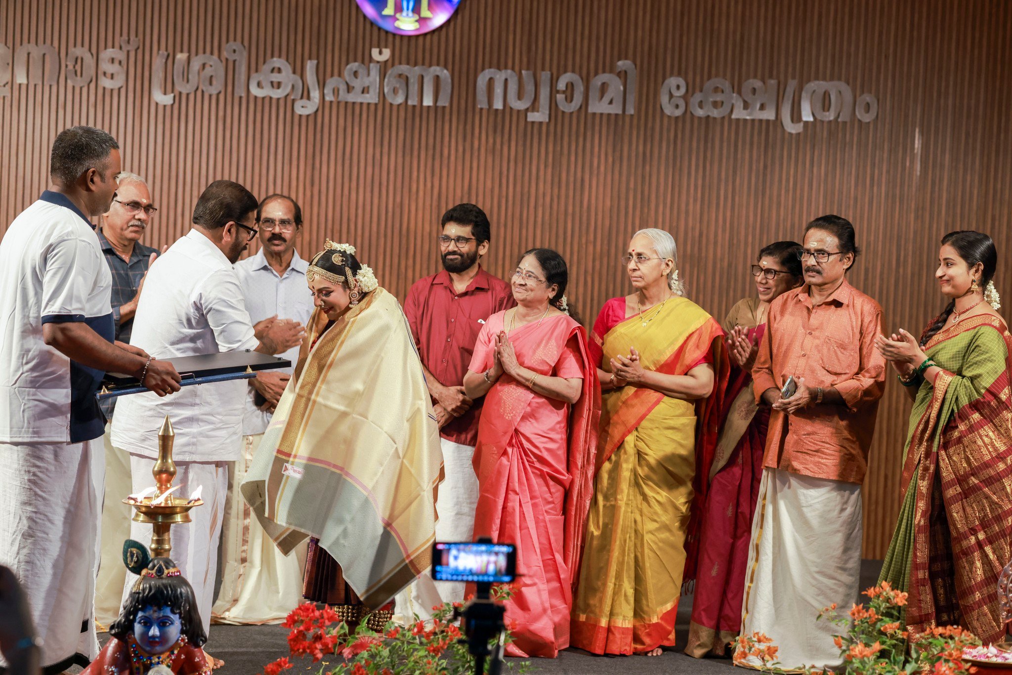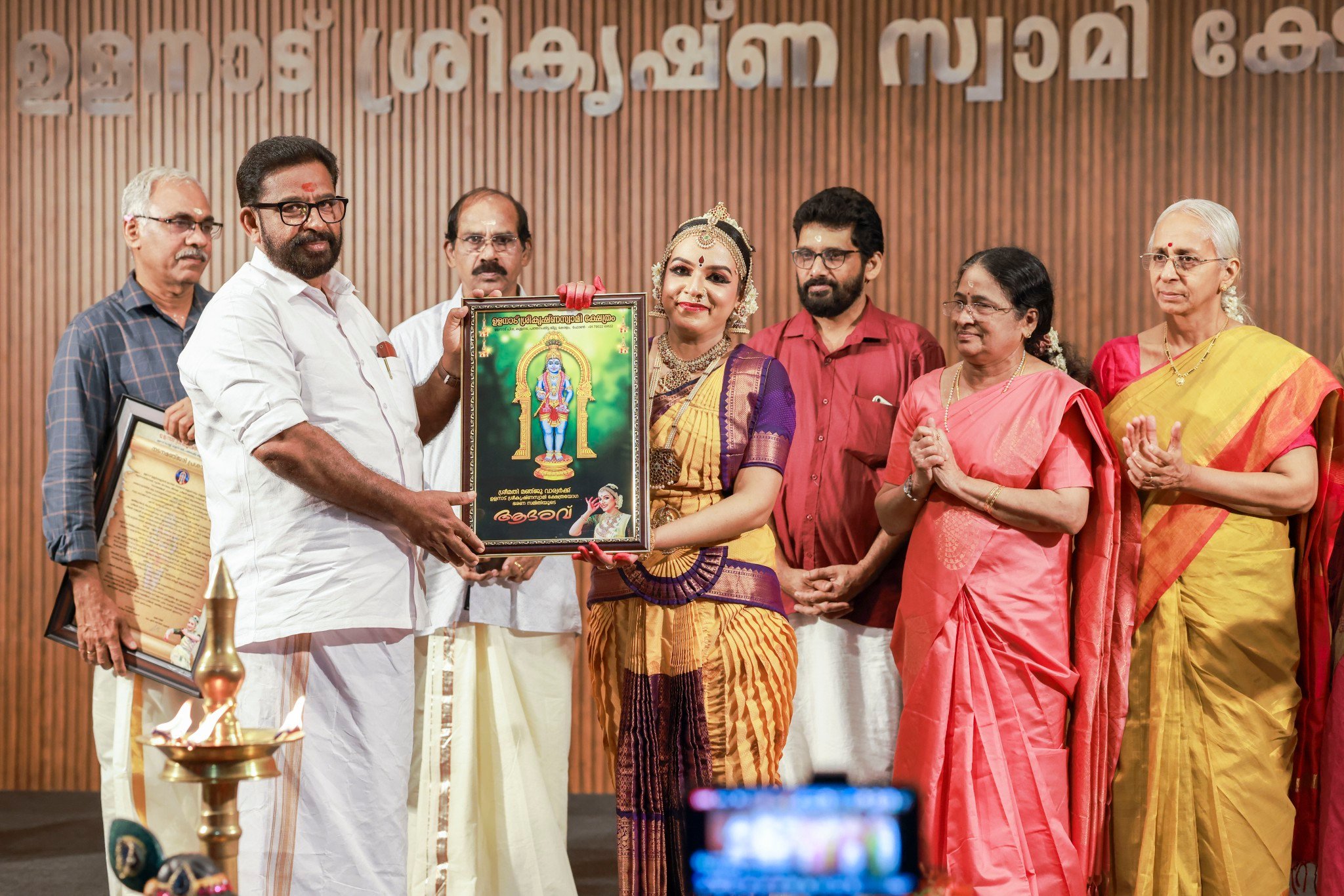 Smt. Manju Warrier recently was awarded the Nadana Manjari puraskar from Ulanadu Sree Krishna Swami temple, Kuladana, Pandalam, Kerala for her exemplary Bharathanatyam performance at the temple